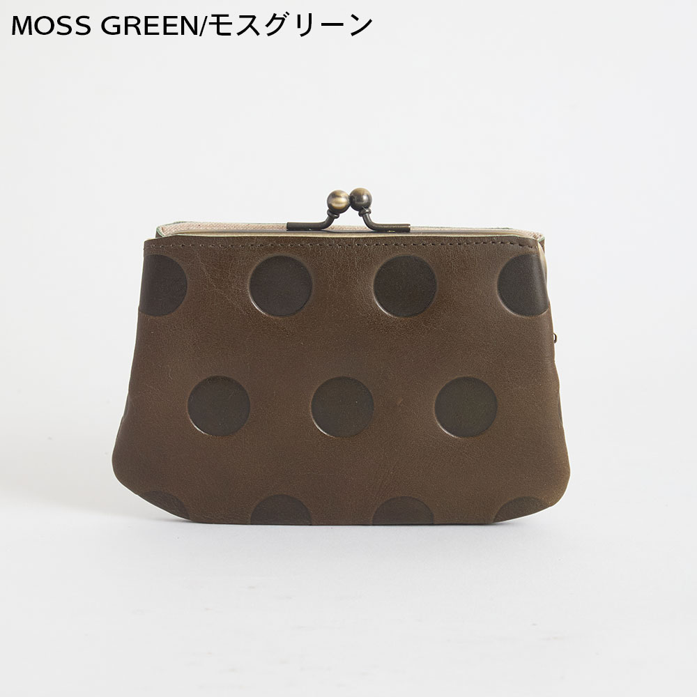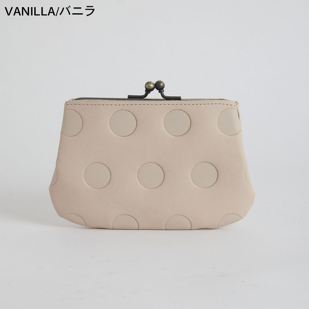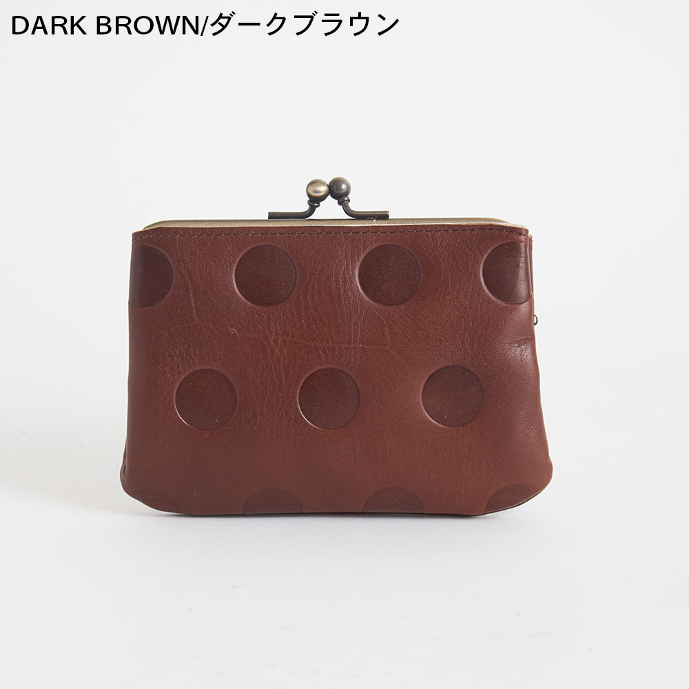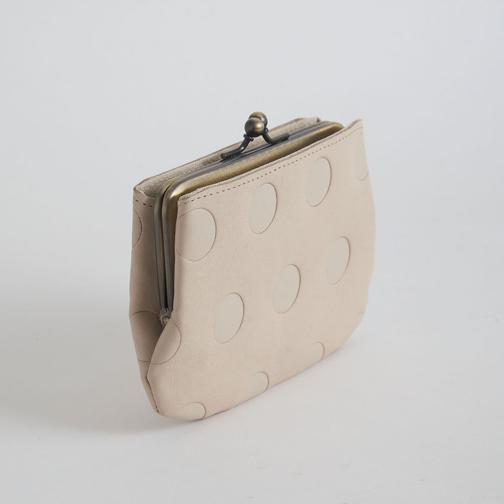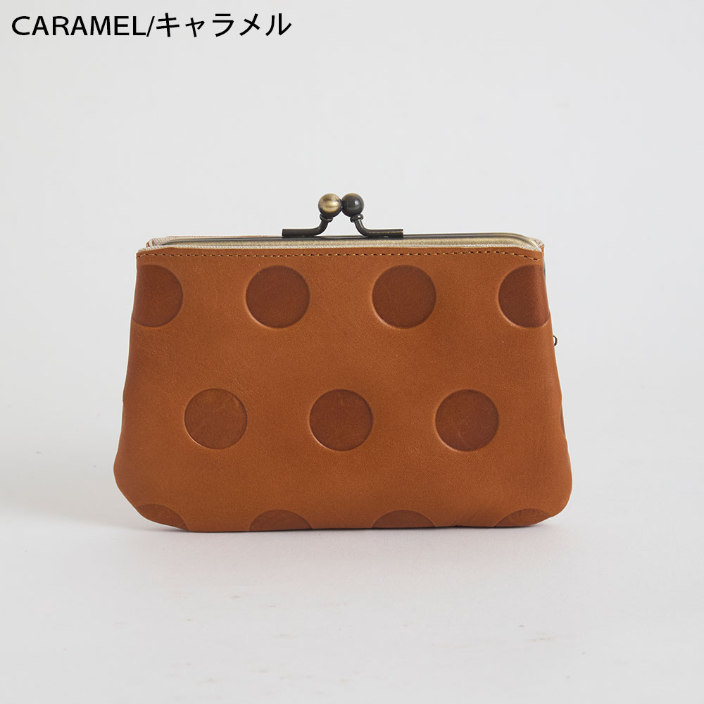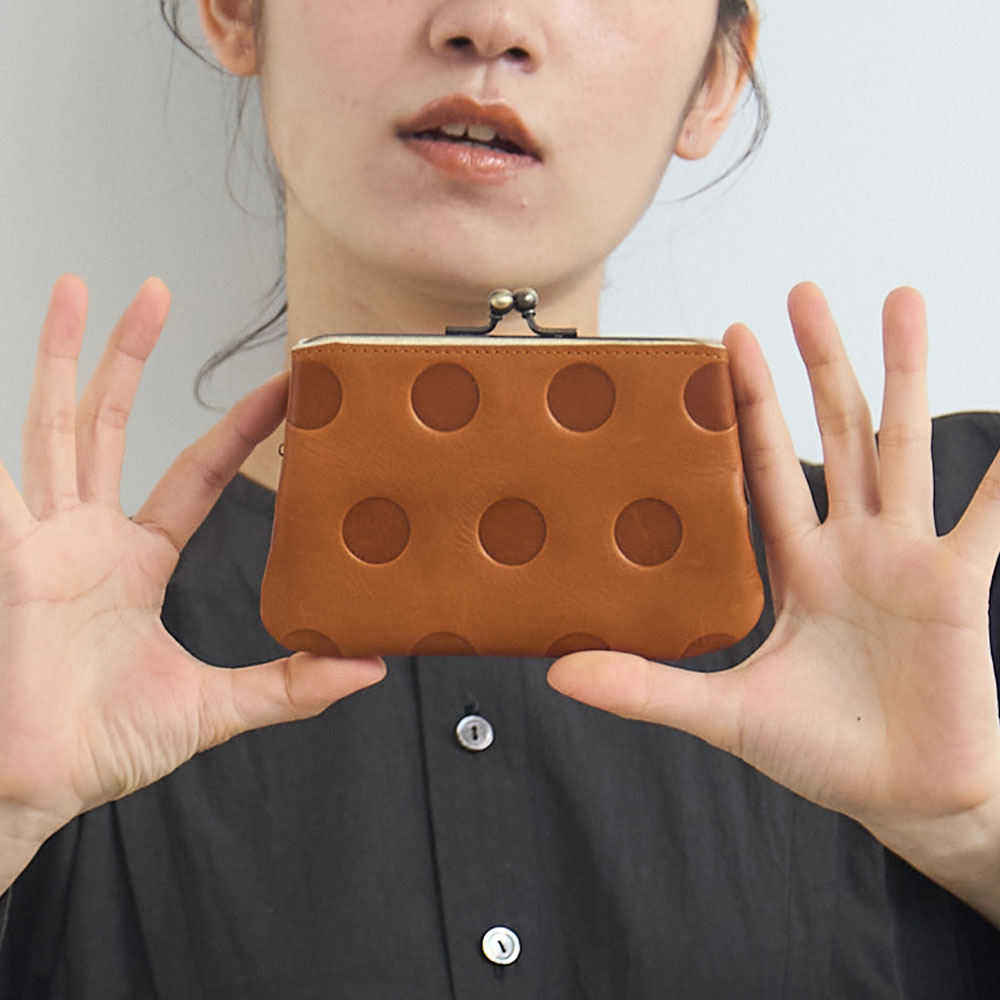 シブなめしのアンティーク風 wax仕上げの風合いのよい革です。凸凹なドット柄に肌なじみのいいカラーが日常に大人のの可愛らしさをプラスしてくれます。丸の大きさ・間隔・配置もすべてオリジナルで、いちばんしっくりくるデザインにこだわりました。