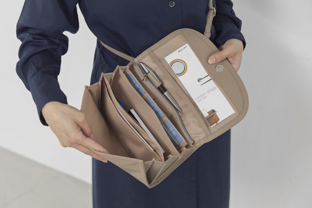 蛇腹タイプのデザインなので、大きく開き中身が見やすく、奥のものも取り出しやすい構造です。