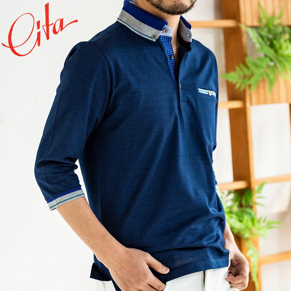 イタリア製 ストライプ 7分丈 ポロシャツ インディゴ染め ボタンダウン [CITA / チータ][セール対象][あす着対応]