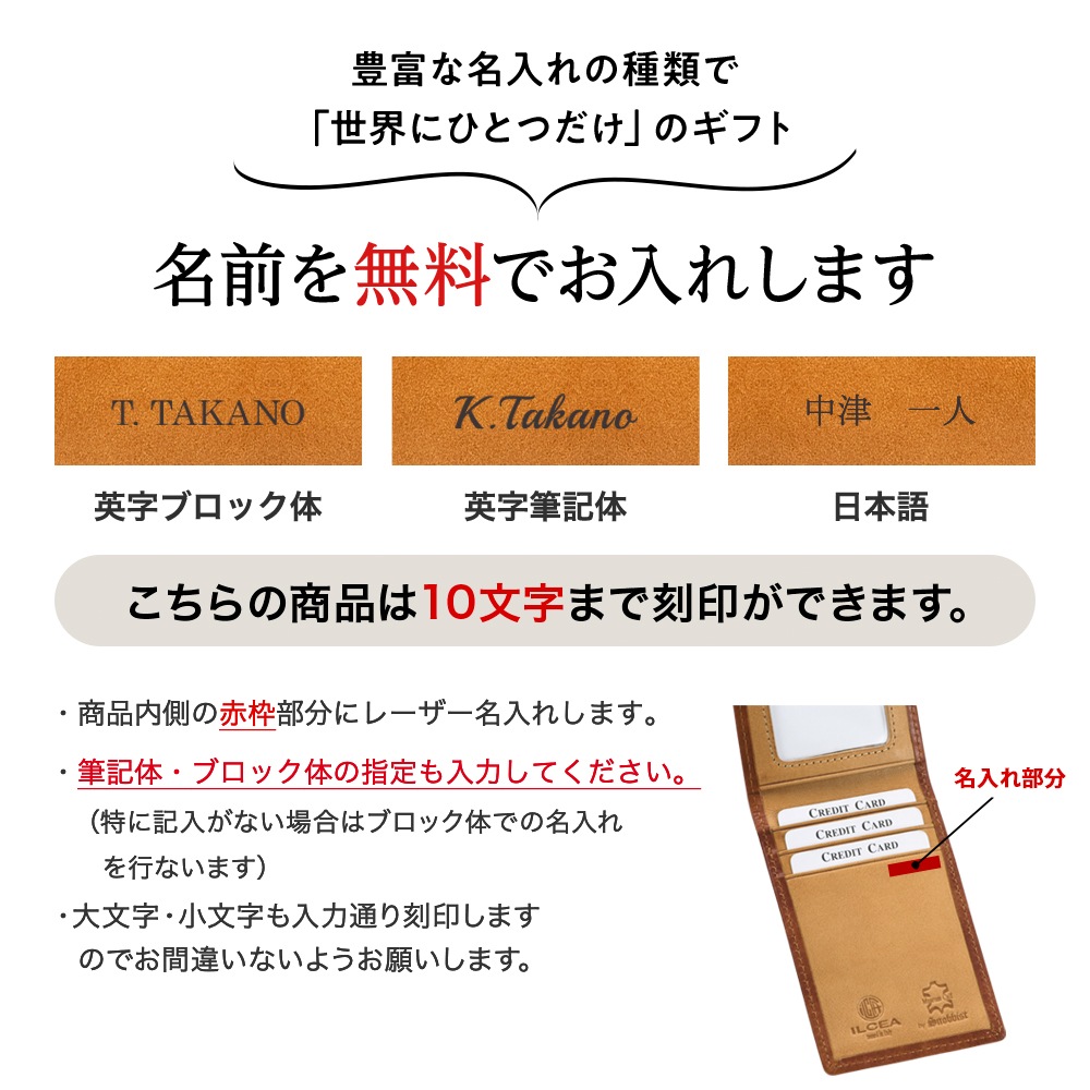 「たった1つのもの」をコンセプトとしており、 名入れ可能な商品にあなたのお名前や大切な方のお名前を無料で刻印いたします。※商品名に 名入れ無料 とある商品のみ。