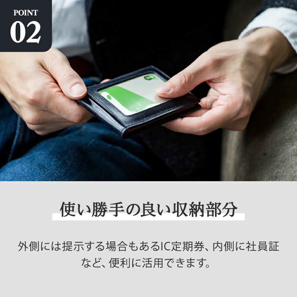 | 商品詳細 | イタリア老舗タナリー・イルチア社による、高級靴にも使用される「ミュージアムカーフ」で仕立てたスリムな定期入れです。カーフ(仔牛)レザー特有のきめ細かい質感と柔らかな触感は、長く愛用するにふさわしい気品を携えています。外側と内側に2つのクリアカードポケットを搭載。外側には提示する場合もあるIC定期券、内側に社員証など、便利に活用できます。日常使いのパスケースとしてだけでなく入学・就職・父の日・クリスマスなどのギフト、企業・学校などの記念品などにも最適です。 |