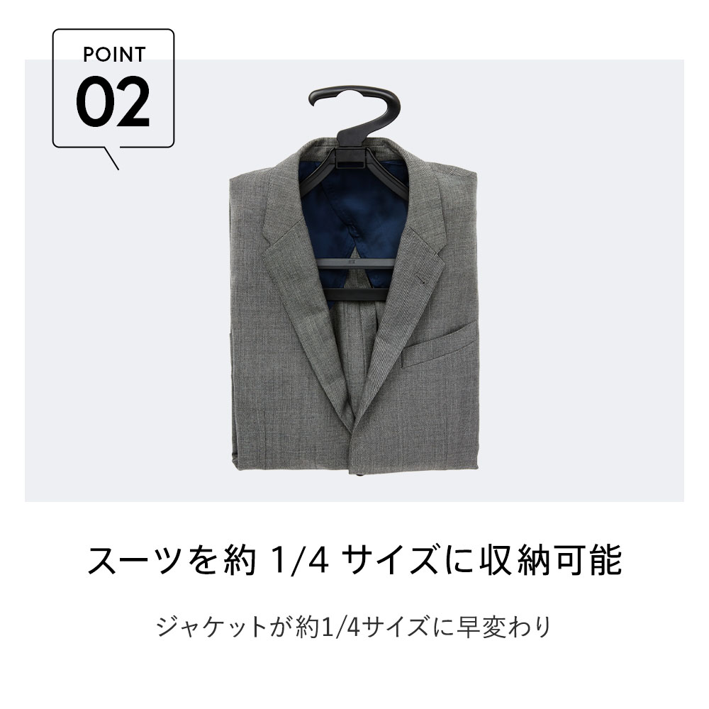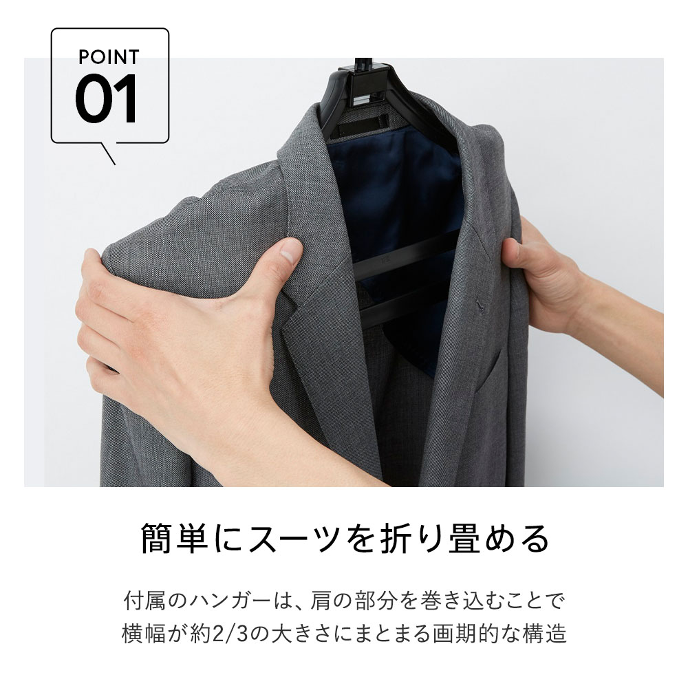 | 商品説明 | 「スーツを最小限コンパクトに収納したい」そんなビジネスマンのソリューションとして開発された、何かとかさばりがちなスーツを、シワを気にせずコンパクトに持ち運ぶことができる便利なツールです。 スーツを約1/4サイズに収納可能。付属のハンガーは、肩の部分を巻き込むことで横幅が約2/3の大きさにまとまる画期的な構造。スーツの型崩れやたたみジワを防ぎながら、コンパクトなサイズに。専用のパンツ巻きつけボードで折りジワを軽減。ワンツーフィニッシュハンガーケースはスーツケースに入れる事が出来るパッキングタイプ。 |