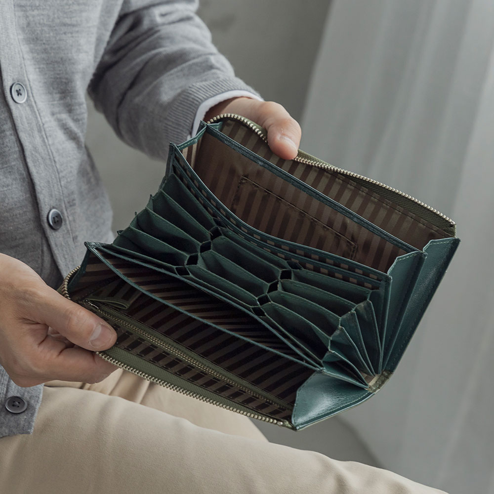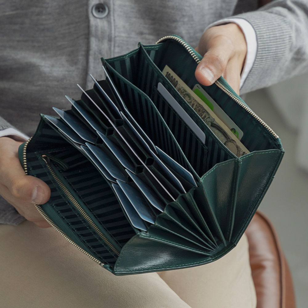 タテ型の蛇腹式構造のカードスロットで、必要なカードが一目瞭然。札入れは2室あります。銀行通帳、 パスポート、外貨の仕分けなど便利。トラベルウォレットとしても活躍します。