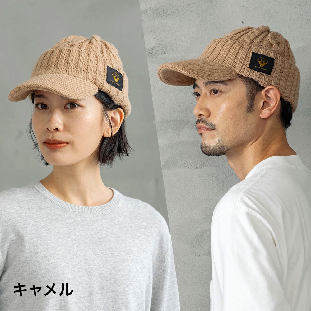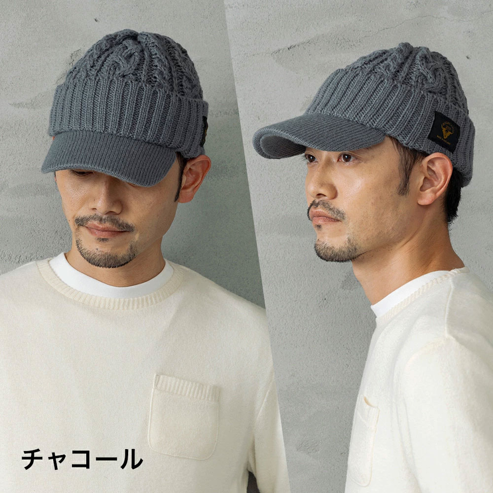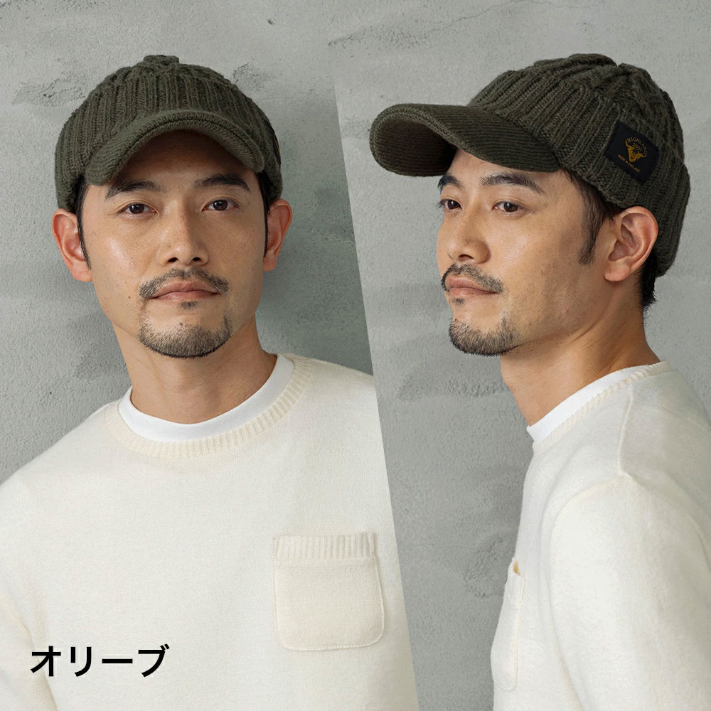 小顔効果ありの長めつば付き仕様に、英国伝統のケーブル編み柄も秀逸で、男女兼用で様々な大人のスタイルにマッチします。