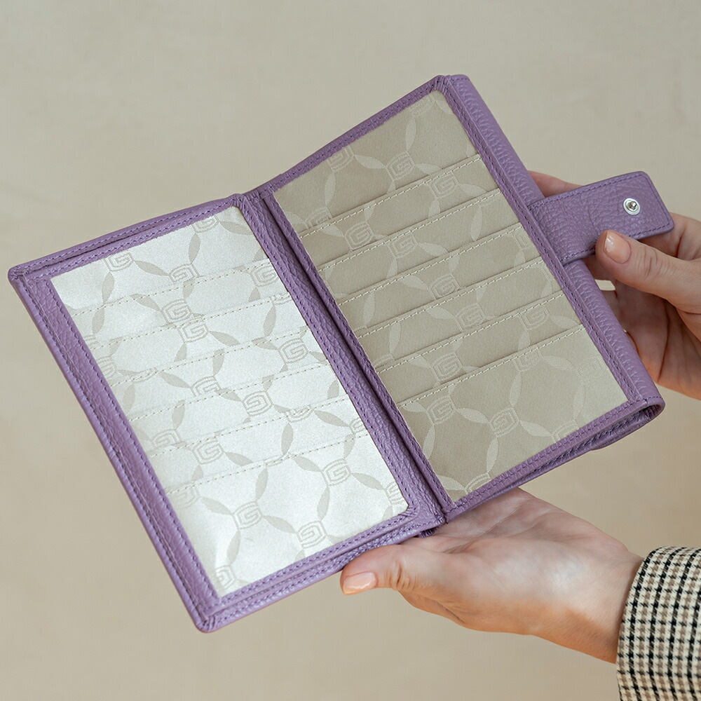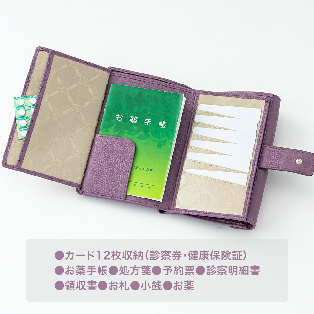 | 仕様 | 札入れ×2、ファスナー小銭入れ×1、オープンポケット×3 カードポケット×12、お薬手帳用あおりポケット×1、書類用ポケット(A5サイズ)×1 |