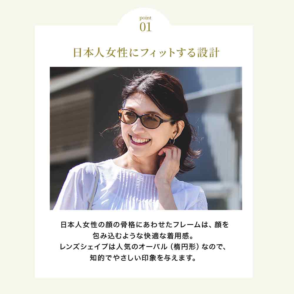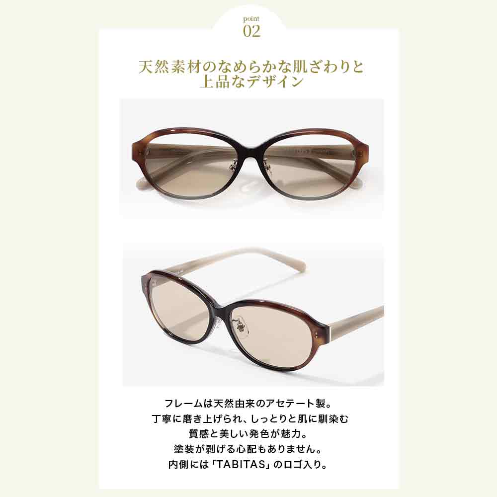 | 商品詳細 | 旅や日常を快適にするブランドTABITUSから日本人女性のための通年で使用できる薄色サングラスが新登場。 白内障やシミの原因となる紫外線対策に、季節を問わず通年で使用できる、人工メラニンを配合した薄色のサングラスです。 日本人女性のための上質なデザインと心地良いかけ心地。 |