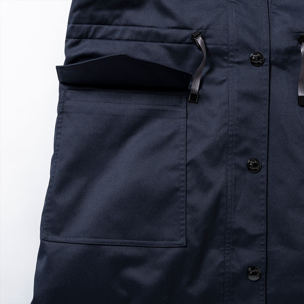 | 素材 | 表地:ポリエステル63%、コットン34%、ポリウレタン3% 裏地:ポリエステル100% 付属ライナーダウンベスト:表裏地:ポリエステル100%、 中綿:ダウン90%、フェザー10% |