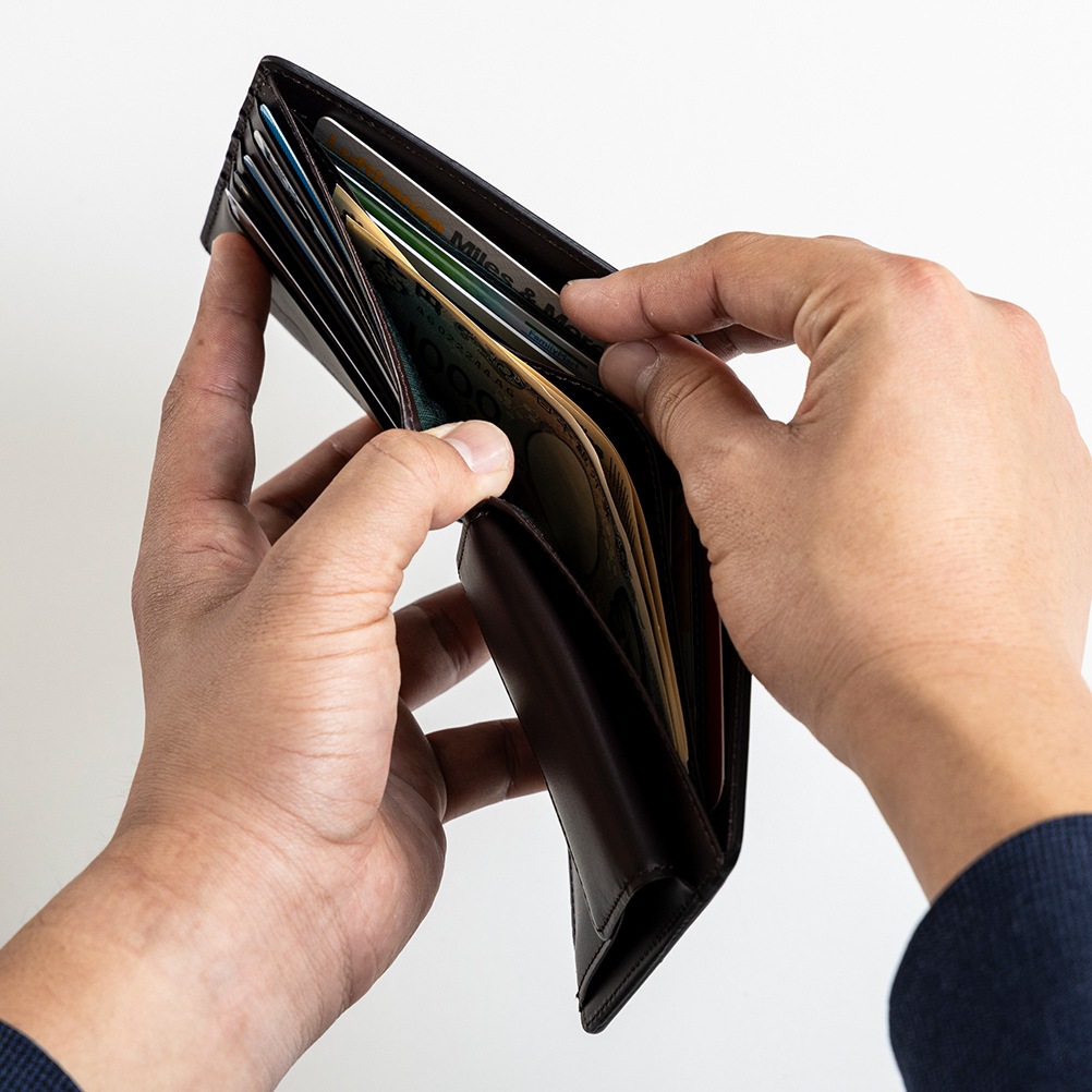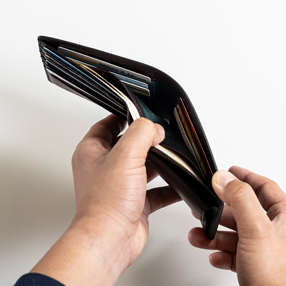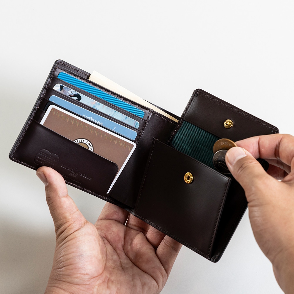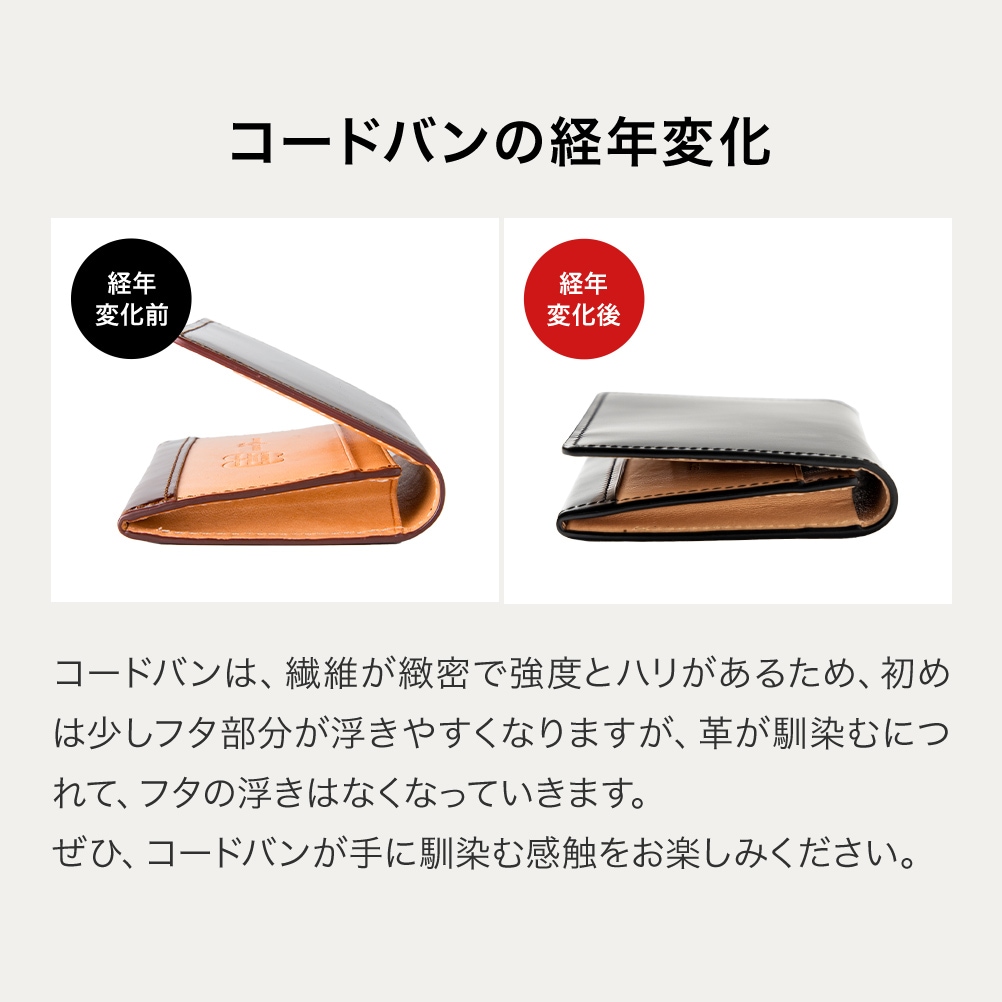 | 商品説明 | レザーの王様コードバン革の輝きが美しい、日本製二つ折り財布です。 カードが合計10枚入る細部にもこだわった収納力と、洗練されたフォルムが美しいデザインは永くお使いいただくことができ、日に日に風合いを増していく革の変化もおたのしみいただけます。 |